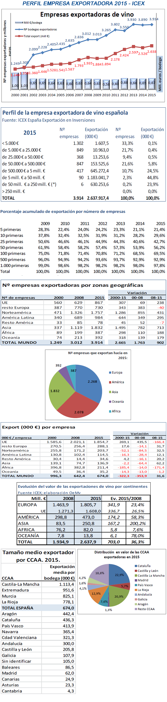 Según informe elaborado por ICEX España Exportación e Inversiones, analizado por el Observatorio Español del Mercado del Vino (OEMV), durante el año 2015, 3.914 empresas exportaron vino por un valor de 2.638 millones de euros. Con respecto a 2014, se produce un ligero aumento del +0,6% en cuanto al número de empresas exportadoras y un crecimiento del +4,4% en cuanto a la facturación por las exportaciones de vino.