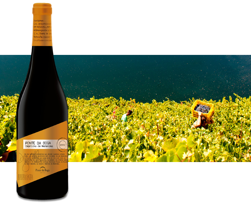 Así es Capricho de Merenzao, una auténtica bomba. Adega Ponte da Boga está situada en un paraje de belleza incontestable, con una orientación hacia al sol, lo que confiere singularidad a sus vinos. El rio Sil se convierte en testigo del trabajo de los agricultores que luchan contra las escarpadas laderas del Gran Cañón para trasportar una caja de ésta variedad, la Merenzao. Completa el coupage la sousón, la brancellao y la Mencía, en un 15% más. Delicada selección del fruto que pasa 10 meses en barricas usadas de roble francés bajo la atenta mirada de Rubén Pérez y Dominique Roujou.