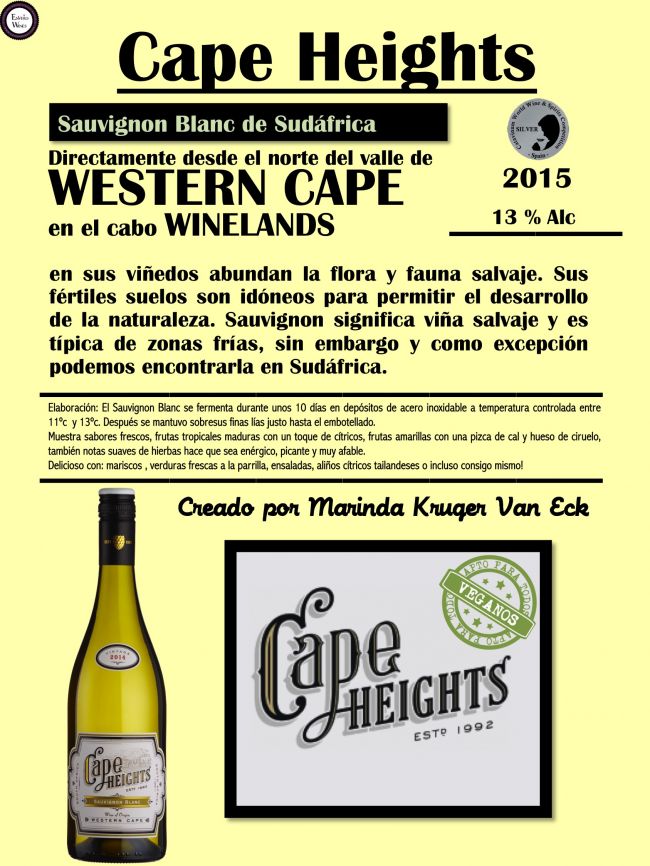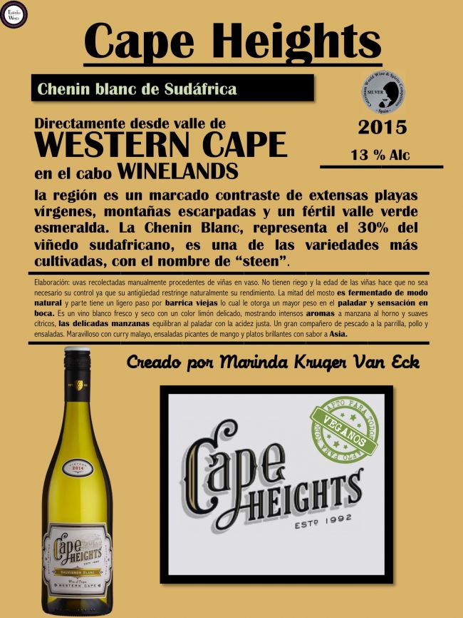 Cape Heights es nuestra serie de vinos que reflejan la diversidad y el carácter del Cabo Occidental de Sudáfrica, una zona de viñedos en la fresca costa y en las cálidas regiones del interior, que se extiende hasta las altas cumbres de las montañas. El estilo y el sabor se mantiene mediante la adición de una porción de vino del año anterior a la cosecha actual y los vinos se mantienen en sus lías finas hasta su embotellado para garantizar la frescura. La forma de la etiqueta ha sido influenciada por parte de la arquitectura distintiva en el Cabo.