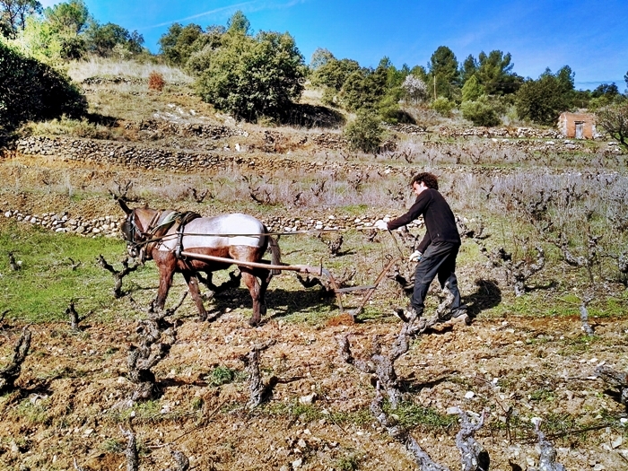 "Hay zonas imposibles de entrar con una máquina. La mula no pesa lo mismo que un tractor y esto favorece que las raíces de la viña puedan expandirse. No lo hacemos por la foto. Tratar una finca con herbicidas y con maquinaria te lleva un par de días y de ésta manera podemos pasar una o dos semanas", Bixente lo tiene muy claro. El factor tiempo parece no tener el mismo sentido para ciertas cosas en Mas Alta.
