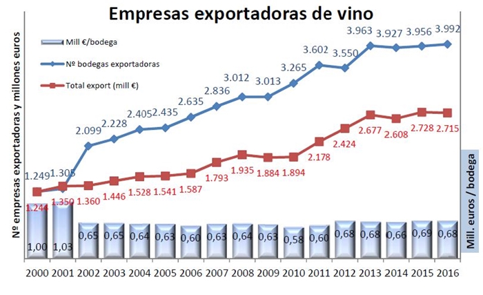 Si a principios de este siglo, las cerca de 1.300 bodegas exportadoras vendían fuera de nuestras fronteras una media superior al millón de euros por empresa, la entrada de muchos nuevos jugadores ha hecho disminuir esa media hasta poco más del medio millón de euros por empresa en 2010, subiendo desde entonces hacia los 680.000 € de 2016.