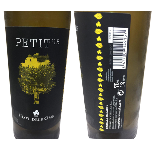 El Petit Clot dels Oms se presenta en una botella tipo Bordelesa de cristal verde oscuro, con una única etiqueta que ocupa toda la parte frontal y buena parte del lateral. En la parte central es completamente negra, con una hoja de vid, que hace las veces de marco de una fotografía de la bodega Ca n'Estella. El nombre del vino, la añada y el logo de la bodega aparecen en blanco. En el lateral Izquierdo, encontramos el código de barra, todas las informaciones legales, las que nos quiere dar el productor (variedades) y una serie de hojas amarillas que hacen de separación entre este lateral y la etiqueta principal. El Tapón está protegido por una cápsula amarilla, con el nombre en negro y pequeño en la base y la etiqueta de la D.O. en la parte superior.
