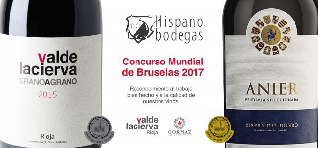 Una vez más la calidad de los vinos del Grupo Hispanobodegas y concretamente de Anier Vendimia Seleccionada 2015y Valdelacierva grano a grano 2015 han sido premiados en un concurso internacional, en está ocasión, el Concurso Mundial de Bruselas 2017. Dos vinos del grupo de denominaciones de origen diferentes: Rioja y Ribera del Duero consiguen dos grandes metales: "Anier Vendimia Seleccionada" medalla de Oro y "Valdelacierva grano a grano" medalla de plata. Estos dos nuevos premios se unen al nutrido y variado palmarés nacional e internacional que tienen ambos vinos. El certamen ha tenido lugar en Valladolid y se han catado 9.080 vinos por más de 320 especialistas de todo el mundo, por lo que las medallas de oro logradas cobran una gran importancia dada la magnitud del concurso.