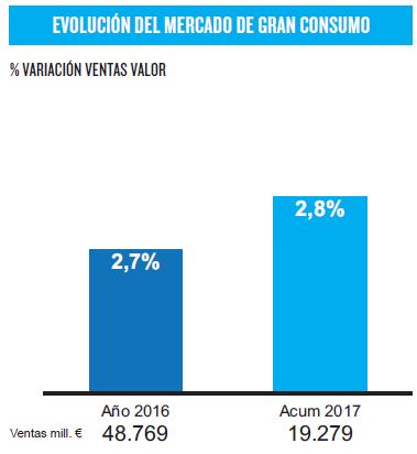 El conjunto de ventas en libreservicio del mercado español (supermercados, hipermercados, tiendas, comercio,...) de todos los productos (Gran Consumo) creció un 2,8% en los primeros cinco meses del año, hasta los 19.279 millones de euros, tras cerrar 2016 con aumento del 2,7% por 48.769 millones de euros, según el nuevo informe Market Trends de Nielsen