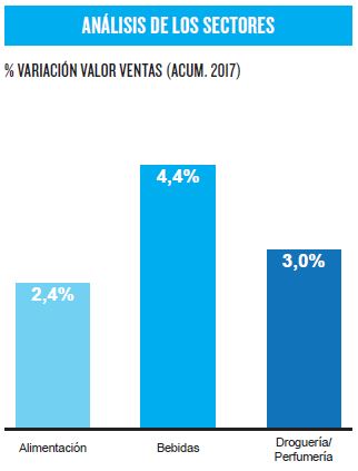 El sector de alimentación creció un 2,4% hasta los 12.438 millones de euros, y el de droguería y perfumería, un 3% hasta los 4.019 millones.