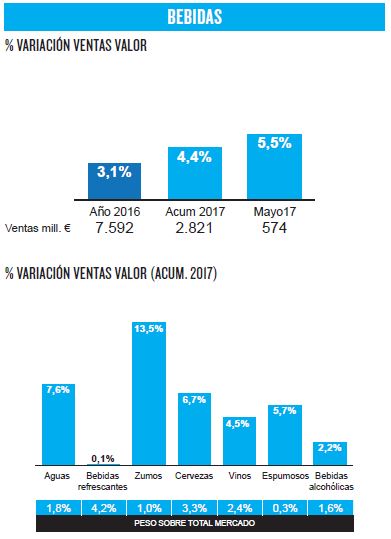 El conjunto de bebidas creció un 4,4%, hasta los 2.821 millones de euros. Destaca el espectacular crecimiento para las ventas en valor de los zumos (+13,5%), de las aguas (+7,6%) y de las cervezas (+6,7%), con subidas más moderadas para las bebidas alcohólicas (+2,2%) y las bebidas refrescantes (+0,1%).