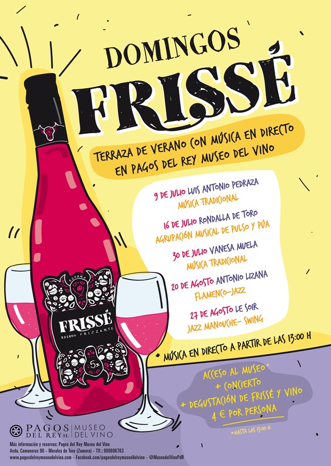 Domingos Frissé, combina la posibilidad de visitar el museo, conociendo las instalaciones de jardín, sala de depósitos y mirador de barricas que incluye el recorrido en visita libre desde las 11:00, hora de apertura del museo, hasta la 13:00 h., con la música en directo mientras se degusta Frissé y vinos de Pagos del Rey en el espacio exterior del museo con la misma entrada, fijada en 4 € por persona.