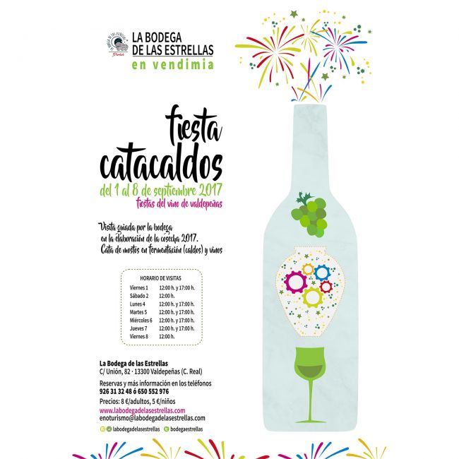 Al igual que los dos últimos años, hemos vuelto a preparar una visita especial de vendimia durante las Fiestas del Vino de Valdepeñas, "Visita Catacaldos". Mostraremos de nuevo la elaboración de cerca, y tendremos preparada una cata especial de uvas, caldo ya en elaboración y vinos. Queremos que tanto locales como la gente que viene a visitarnos pueda participar en una actividad que les pone directamente en contacto con el vino en una bodega en plena elaboración, haciendo especial hincapié en niños, jóvenes (de todas las edades) y familias.