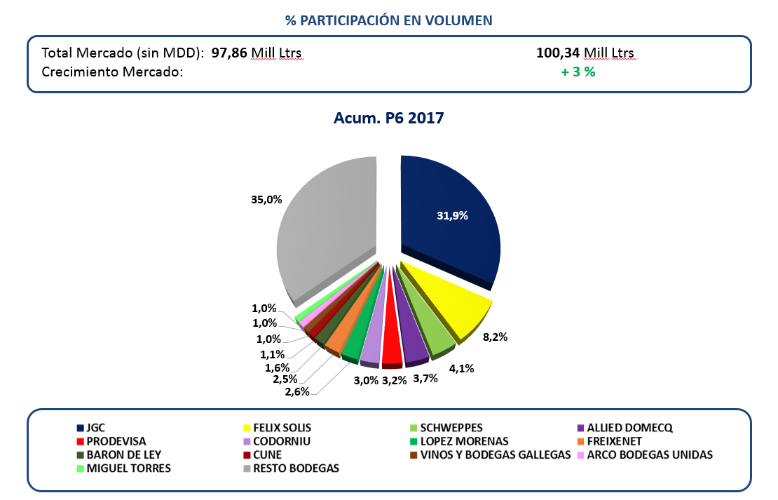 Además dentro del mercado de vinos con Denominación de Origen, García Carrión es líder con un 23% de la cuota de mercado teniendo las marcas más reconocidas como Pata Negra, 3 años consecutivos la marca más vendida en Navidad.