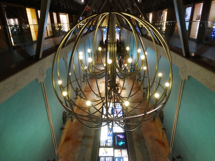 Desde aquí subimos a la segunda planta, recorrida por una pasarela en sus laterales que deja como balcón mirador la zona central, con la vista desde arriba de todo lo que acabamos de conocer en la planta baja. En este punto, es imposible no quedar hipnotizado por las enormes y originales lámparas que iluminan y decoran el edificio.