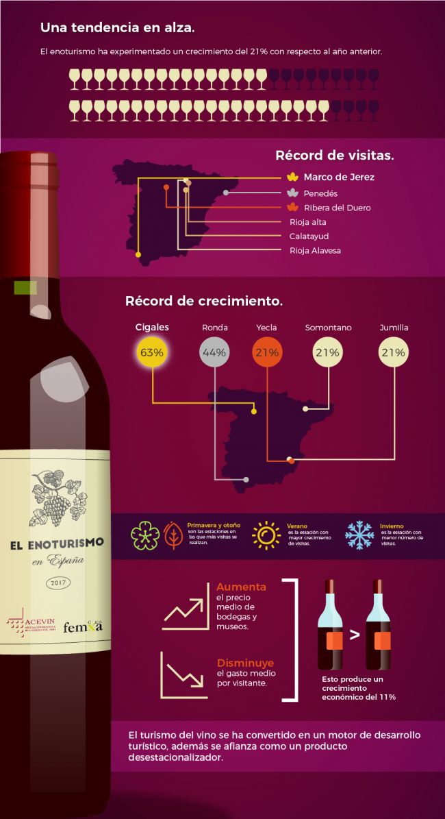 Los destinos que mayor éxito han tenido han sido: Marco de Jerez, Penedès, Ribera del Duero, Rioja Alta y Calatayud. Pero las zonas que más crecimiento han experimentado han sido las de Cigales, Ronda, Yecla, Somontano y Jumilla.