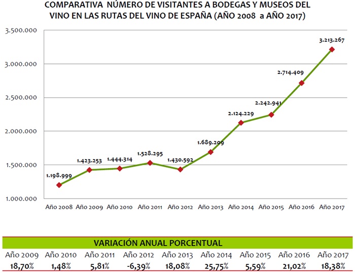 Los datos recogidos durante 2017 en las 27 Rutas del Vino que durante el pasado año conformaban este club de producto vuelven a constatar un incremento en el número de visitantes registrados por las bodegas y los museos de las rutas integradas en Rutas del Vino de España. La cifra total asciende a 3.213.267 visitas, lo que supone un incremento respecto al año anterior del 18,38%, el tercero más elevado desde que se miden estos datos por parte del ACEVIN (el presente informe es el décimo consecutivo desde el 2008).