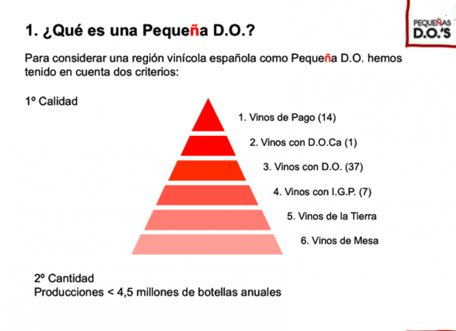 Pues bien, para que una región vinícola sea considerada como Pequeña D.O. el primer criterio que debe de cumplir es pertenecer a alguna de las 4 categorías más altas de esta pirámide, en total nosotros tenemos recogidas un total de 59 regiones vinícolas con esta distribución: