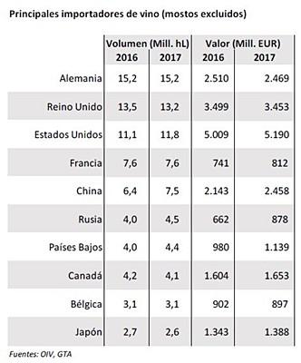 Estados Unidos se distancia de Reino Unido como primer inversor mundial y se consolida como primer mercado mundial en términos de valor, invirtiendo 225,7 millones de euros más por sus compras de vino en 2017, aunque crece por debajo de la media (+4,5%) hasta alcanzar los 5.234,4 millones de euros.