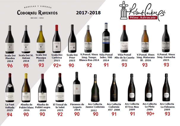 Complementa los plenos de Abadía de Poblet y Ars Collecta Codorníu, la icónica bodega Scala Dei (D.O. Ca. Priorat), con las puntuaciones más altas de la categoría, Scala Dei Masdeu (2014) y Scala Dei Sant Antoni (2014) con 96 y 95 puntos respectivamente, siendo los mejor valorados de la clasificación y seguidos por Scala Dei Massipa (2015) con 93 puntos, Scala Dei Cartoixa (2015) con 92+ y Scala Dei Prior (2015) con 90 puntos Parker. Scala Dei es la bodega más antigua del Priorat. Fue establecida por los monjes Cartujanos en el año 1163 y hoy por hoy conserva el mismo espíritu del trabajo artesanal hecho a mano que impregna a sus vinos tradición, excelencia y calidad.