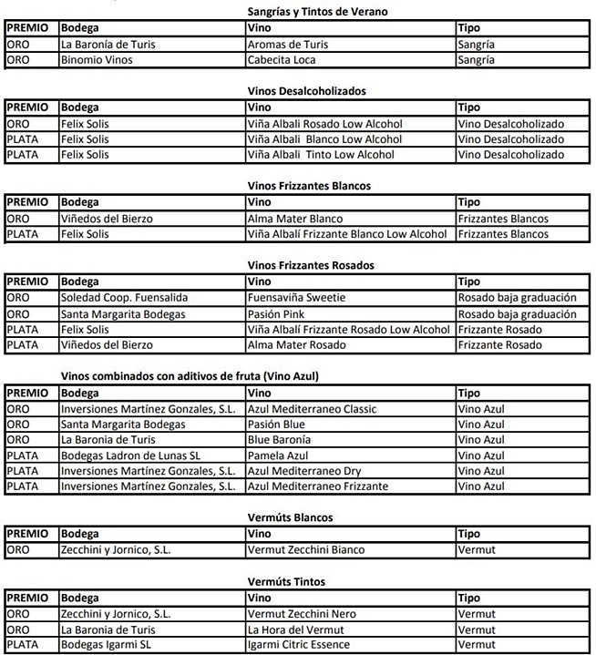 Varias bodegas han demostrado su gran dominio en lo referente a la calidad de estos productos vínicos, obteniendo varias medallas para varias de sus bebidas en diversas categorías. Así, Félix Solís ha copado la categoría de Vinos Desalcoholizados, con una medalla de Oro para su Viña Albali Rosado Low Alcohol y sendas medallas de Plata para sus Viña Albali Blanco Low Alcohol y Viña Albali Tinto Low Alcohol, además de las medallas de Plata conseguidas por su Viña Albali Frizzante Blanco Low Alcohol y su Viña Albali Frizzante Rosado Low Alcohol en las categorías de Frizzantes, blancos y rosados respectivamente.