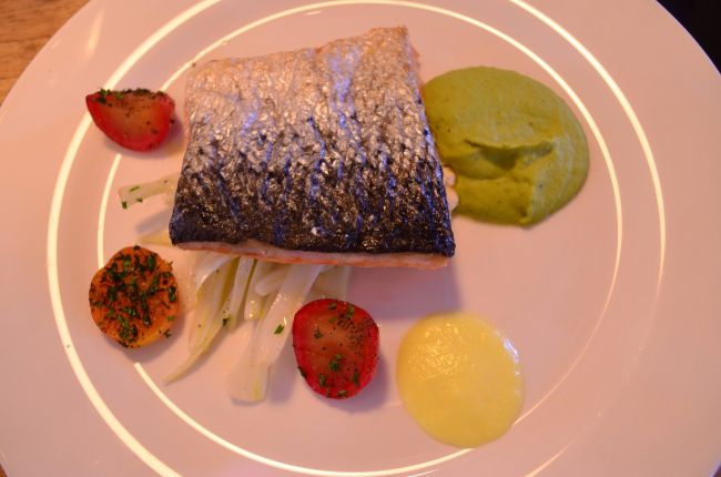 A saber: Bondiola de jabalí con barbacoa casera, ensalada de rúcula, endivias y hongos frescos. El otro salmón rosado con puré de arvejas, hinojo marinado y emulsión de mango.