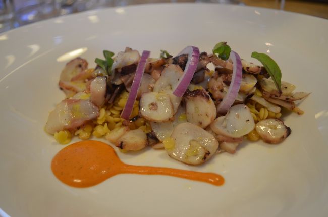 Las entradas fueron: Ensalada de hojas verdes con espárragos, chauchas y tomates confitados, hummus de garbanzo y pulpo marinado en oliva sobre lentejas turcas y emulsión de pimientos.