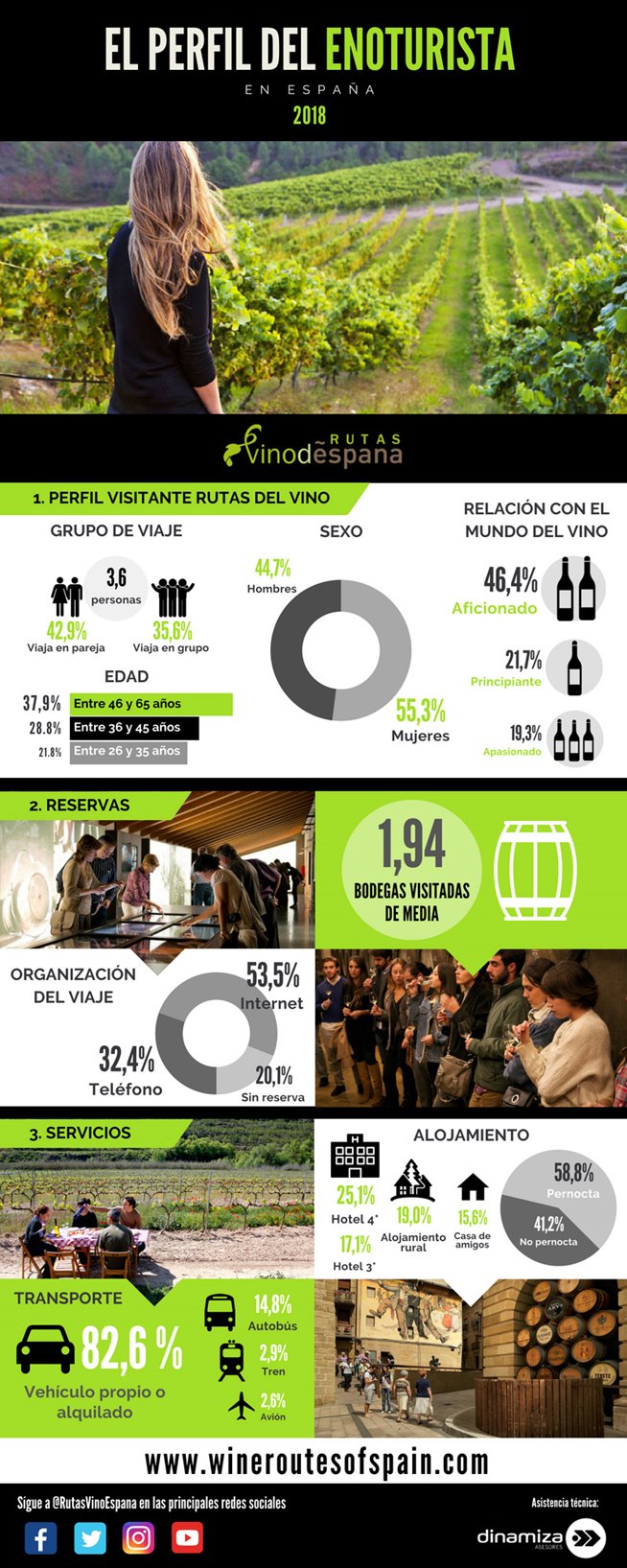 Dentro de los grupos de enoturistas continúan predominando ligeramente las mujeres (55,3%) sobre los hombres (44,7%). Aunque la mayor parte de los encuestados tienen una edad comprendida entre los 46 y los 65 años, el estudio revela que cada vez es mayor el número de personas de entre 36 y 45 años que visitan las Rutas del Vino (38,2%). La franja de edad comprendida entre los 18 y los 25 años también ha experimentado un aumento, pasado del 4,8% al 6,9%.