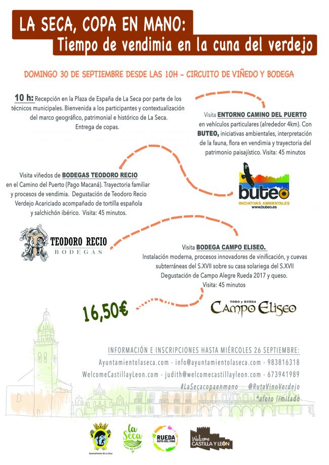 Durante la mañana del domingo 30 de septiembre La Seca ofrecerá al visitante su trayectoria vinícola a través del proceso de vendimia. Con copa en mano el visitante recorrerá los viñedos familiares de Bodega Teodoro Recio, contaremos con la interpretación de la fauna, flora y patrimonio paisajístico de la mano de Buteo Iniciativas Ambientales (guía de naturaleza) y finalizaremos con la visita de Bodega Campo Eliseo.