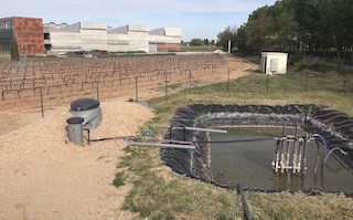 o Balsa de afinado (3) de 40 m3 funcionando 1,5 días como reactor bilógico, aireado con dos hidroexpulsores de 5 kw cada uno y funcionando 1,5 días como decantador. Una vez pasados los 1,5 días los fangos eran bombeados a la balsa Nº1 y el 1 metro superior de la balsa era vertida sobre una Zanja filtrante (4) plantada con Juncos que terminaba en un pozo desde donde el agua se bombeaba a una planta de ozono (5) para su desinfección y posterior almacenamiento, en balsa (6), para su reutilización en el viñedo.