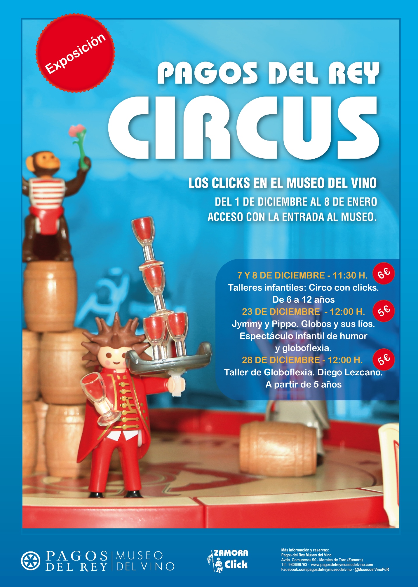 En el taller Circo con Clicks, además de conocer algunas de las instalaciones del museo y visitar guiados por Zamora Click, "Pagos del Rey Circus", los pequeños realizarán su propia carpa de circo y caracterizarán muñecos de Playmobil con artistas de circo. Los talleres se desarrollarán los días 7 y 8 de diciembre a las 11:30 h., y están pensados para niños de 6 a 12 años, con un coste de 6 €.