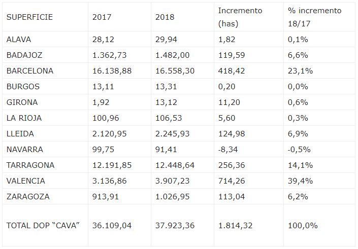 En el año 2016 la superficie de la DO Cava era de 33.903 hectáreas. Ya entonces se advertía del riesgo de aumento de hectáreas, en especial por la replantación y reconversión de derechos de plantación de viñedo. La superficie de viñedo registrada a septiembre de 2017 era de 36.110 ha, confirmando el peor escenario previsto por el Consejo Regulador. En septiembre de 2018, al superficie se ha situado en 37.858 hectáreas, un crecimiento sin precedentes en la historia de esta Denominación de Origen.