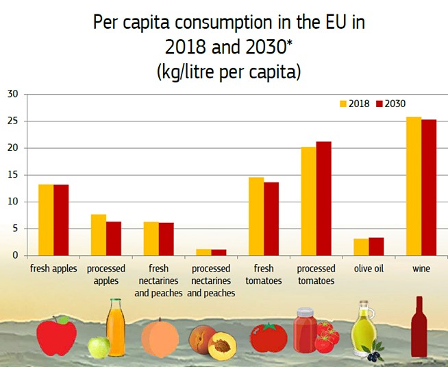 Destaca además que los consumidores, tanto en la UE como en el extranjero, serán más exigentes con los productos que consumen, dando un impulso al valor agregado (como productos locales, orgánicos u otros certificados) por un lado y los cambios entre las categorías de alimentos por el otro.