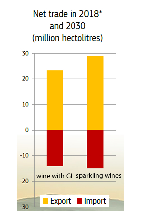 Las exportaciones de vino aumentaron cerca de un 2% por año durante la última década, alcanzando los 24 millones de hl. en 2017/2018, esto ha sido posible gracias a que las exportaciones no se ven afectadas por la fluctuación de la producción debido al efecto amortiguador de las existencias.