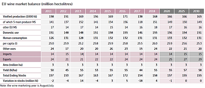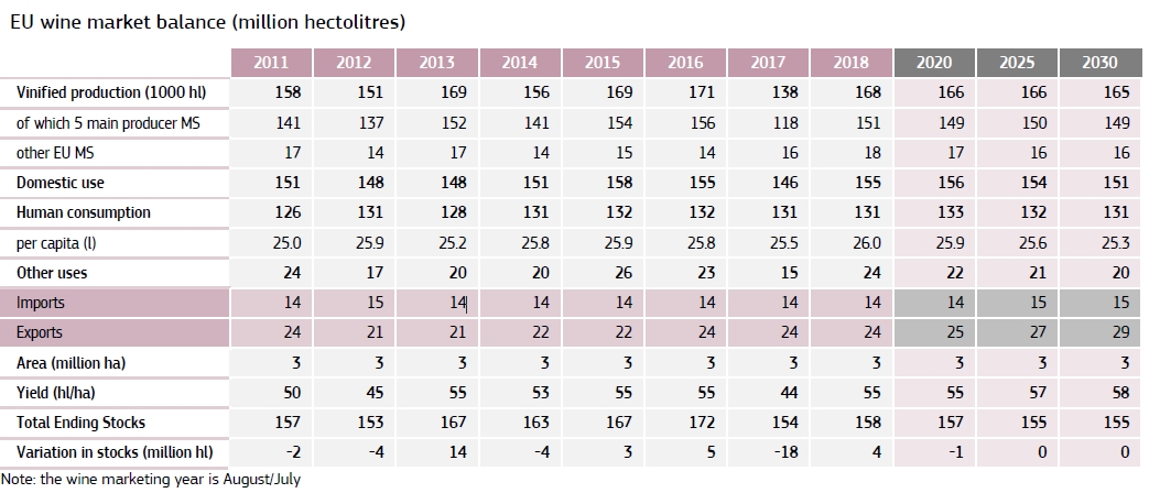 Sobre la base de la demanda y el comercio nacionales proyectados, se espera que la producción se estabilice en 165 millones de hl. Esto contrasta con la disminución del 0.5% anual que se observa entre 2008 y 2018.