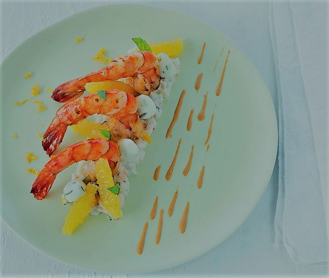 La receta: Gambas al grill de barbacoas, espuma de Rocamadour al estragón.