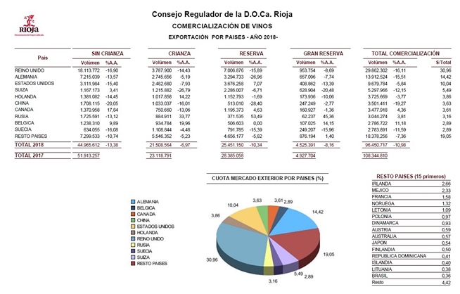 Los negocios de Rioja en los mercados estratégicos clave se han visto menguados durante este ejercicio principalmente por la caída en los dos principales importadores de Rioja: Reino Unido (-16%) y Alemania (-15,51%), frenada que preocupa de manera especial ya que, conjuntamente, representan la mitad de las exportaciones. Estados Unidos, Suiza, Holanda, China y México pierden algo de cuota con respecto al ejercicio anterior y destacan, por otro lado, Canadá, Rusia y Bélgica que cierran el año con resultados positivos.