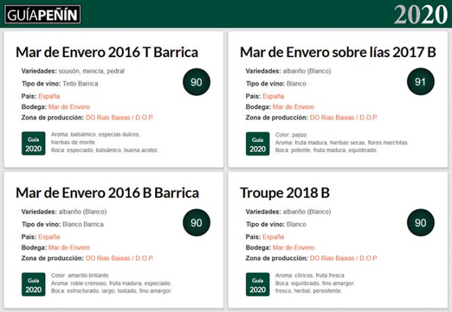 La Guía Peñín de los Vinos de España 2020 incluye más de 12000 vinos catados, entre los que se encuentran los tres albariños monovarietales de la bodega Mar de Envero: Mar de Envero elaborado sobre lías (91 puntos), Troupe (90 puntos), y Mar de Envero «Experiencias del Atlántico» Blanco Barrica (90 puntos).