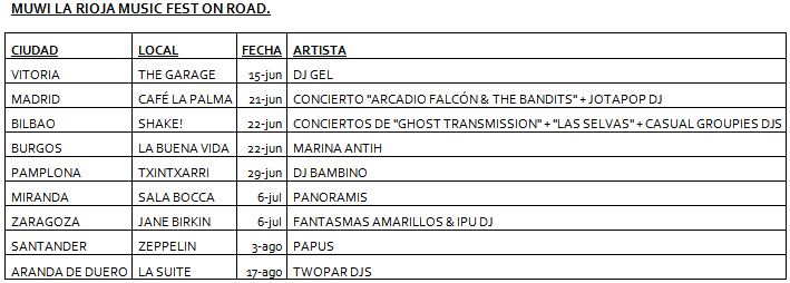 Madrid, Vitoria, Bilbao, Miranda de Ebro, Zaragoza, Santander, Burgos, Pamplona...serán alguna de las ciudades por las que MUWI hará acto de presencia conforme a este calendario hasta finalizar en Logroño: