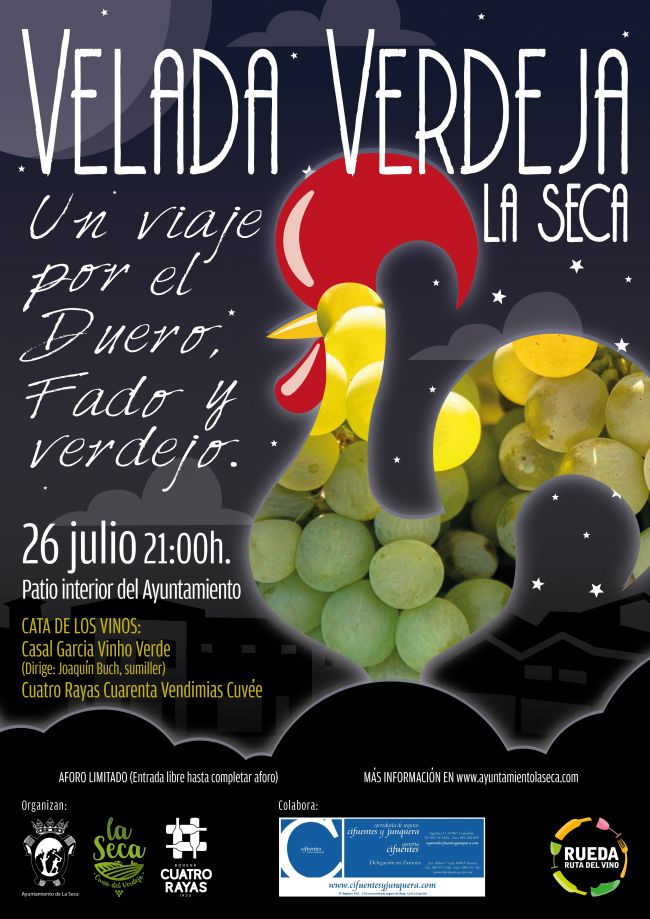 Comienza la SEMANA CULTURAL de La Seca con la ya consolidada Velada Verdeja el viernes 26 de julio desde las 21 horas en el patio interior cubierto del Ayuntamiento. Maridaje de vino con cultura bajo el título "Un viaje por el Duero: Fado y Verdejo" donde los presentes podrán degustar el vino lasecano de Cuatro Rayas, más concretamente su afamado Cuarenta Vendimias Cuvée en sintonía con vinho verde portugés Casal García, todo ello con los fados de la fadista Laureana Geraldes acompañada de guitarra portuguesa y viola de fado.