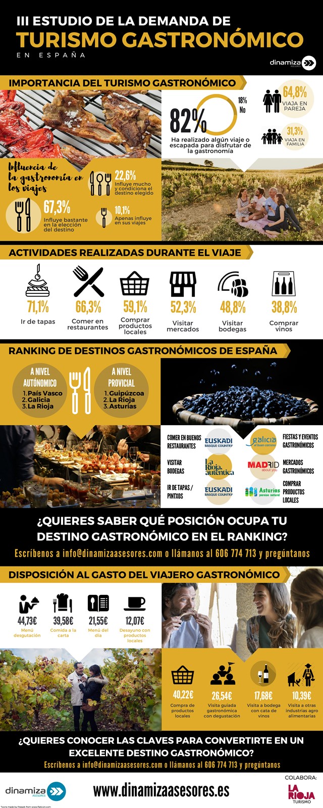Asimismo, el informe destaca las características que debe reunir un destino gastronómico competitivo y los productos de turismo gastronómico más demandados por el público, así como la disposición al gasto en distintas actividades y servicios turístico-gastronómicos. Algunos de estos datos se pueden consultar en la siguiente infografía elaborada por Dinamiza, en la que se encuentran los resultados más representativos de esta edición.