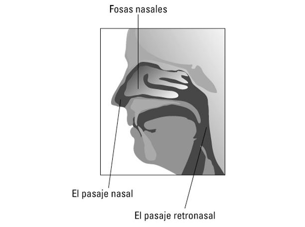 Siguen allí, en el vino, muy cerca del chocolate y las ciruelas. Pero, para ser exactos, esos sabores son en realidad aromas que percibes, no mediante el contacto con la lengua, sino al inhalarlos a través de un pasaje interior de la parte de atrás de la boca que se llama vía retronasal (mira el dibujo siguiente). Cuando aspiras aire a través del vino que tienes en la boca, estás vaporizando los aromas, del mismo modo que cuando dabas vueltas al vino en la copa. (Hay un método que seguir en toda esta locura.)