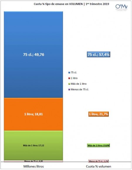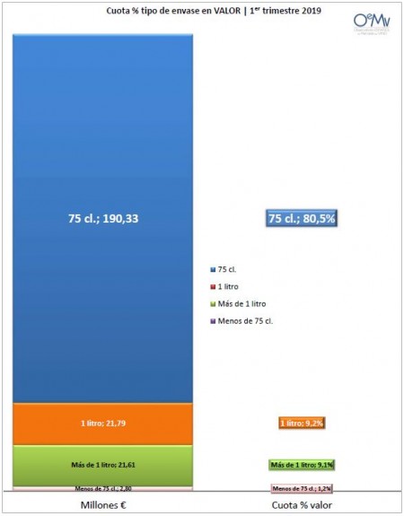 La botella de 75 cl. es claramente el envase más demandado en España con el 57,4% de cuota de mercado por volumen de compras, y algo más del 80% de la facturación total de vino, según los datos del Panel de Alimentación publicados recientemente por el Ministerio de Agricultura, Pesca y Alimentación (MAPA) que recoge el último informe del Observatorio Español del Mercado del Vino (OEMV) relativo al primer trimestre de 2019 relativo al canal alimentación.