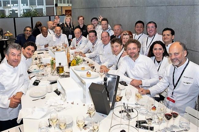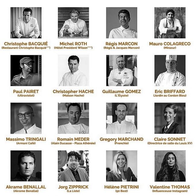 Emmanuel Rubin, Ezechiel Zerah, Christophe Bacquié (el padrino 2019), Arnaud Donckele, Joel Garault, Régis Marcon y Catherine Decuyper (fundadora del SUmmint WOlrd Chefs Jefes de la Cumbre Mundial), Laurent Truyen Conde de Fenouillime, Corinne Truyen Tierno, Carole Le Bagousse, Nicolas Leseur, Corinne Presidente de la Organización Mundial de Gastronomía, Jean-Christophe Michelet, ganador del Concurso Mejor Confiturista del Mundo (Confituriades 2019).