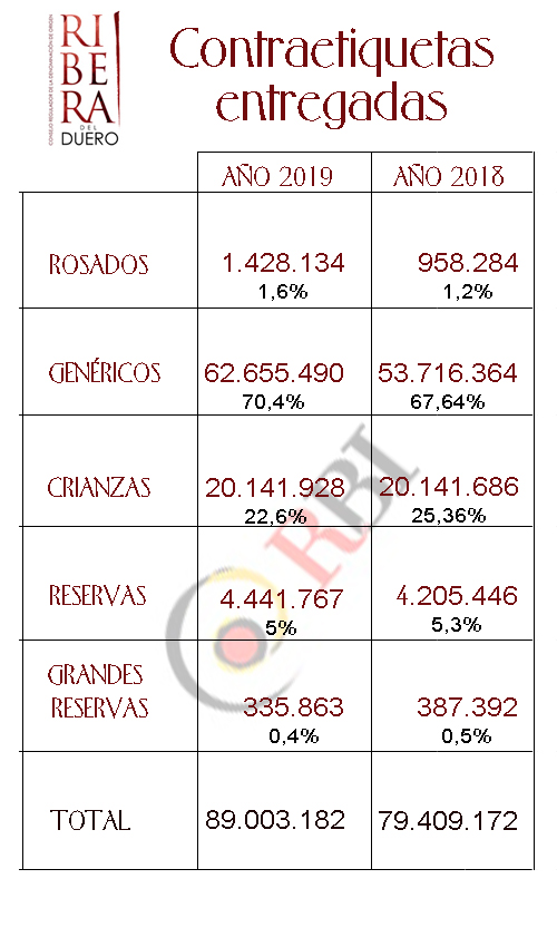 Un 12,08% más que el año anterior es el resultado de las contraetiquetas entregadas desde la DO Ribera del Duero en 2019. Una vez finalizado el año el Consejo Regulador ha dado a conocer los datos estadísticos que indican que en 2019 se han repartido entre las bodegas un total de 89.003.182 contraetiquetas que certifican la indicación del producto. Teniendo en cuenta que en 2018 el número apenas llegó a los 80 millones, con 79.409.172 etiquetas repartidas, el resultado es un aumento considerable de una cosecha que se vio mermada en 2018 a causa de una meteorología muy adversa que dio pie a una escasa producción.