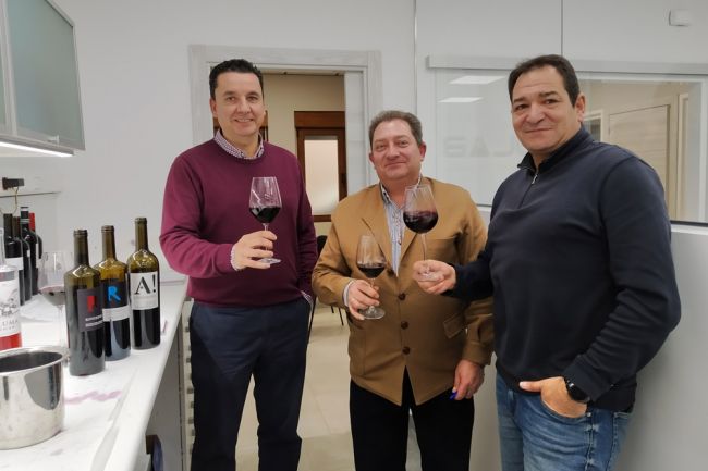 Julio Galán aparece en el centro de la imagen junto, a su derecha, de Alfonso Velasco (director gerente) y dd Angel Luis Margüello (director técnico) haciendo un inciso en la cata de formación.