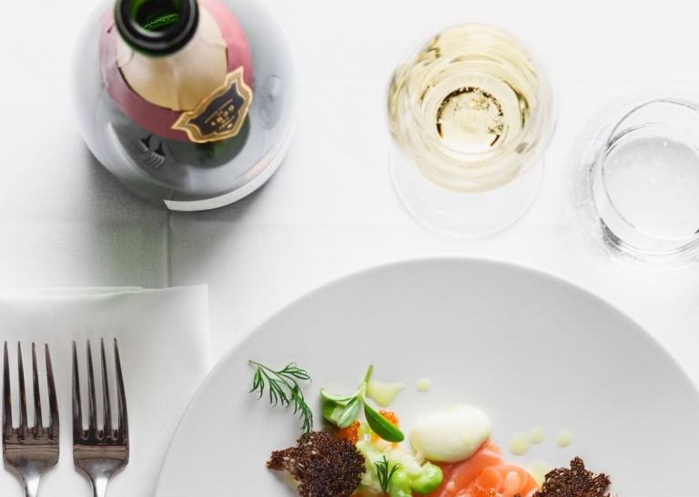 2. Luego podemos tomar un carpaccio de gambas con aceite de pistacho y cebollino, acompañado con un buen sake sparkling junmai nigori y esa sensación densa y fresca que nos dan las bebidas niponas.