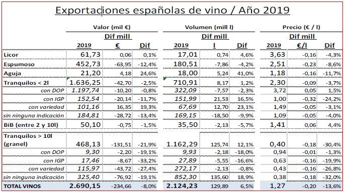 Las exportaciones españolas de vino cerraron 2019 con aumento de las ventas en volumen (+6,5%), pero con caída en términos de valor (-8%), tras reducirse el precio medio un -14%.
