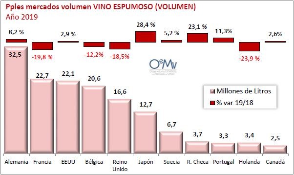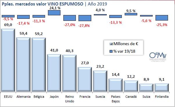 Por mercados, las pérdidas para los espumosos españoles se registran, principalmente, en Francia, Bélgica, Reino Unido y Holanda, donde la caída es tanto en valor como en volumen, y a doble dígito. En Alemania, primer mercado en volumen, y EE.UU., tercero, las ventas aumentan en volumen, pero a precios más económicos, lo que genera una caída de la facturación en ambos casos. EE.UU. es el primer mercado en valor, con 69 millones de euros.
