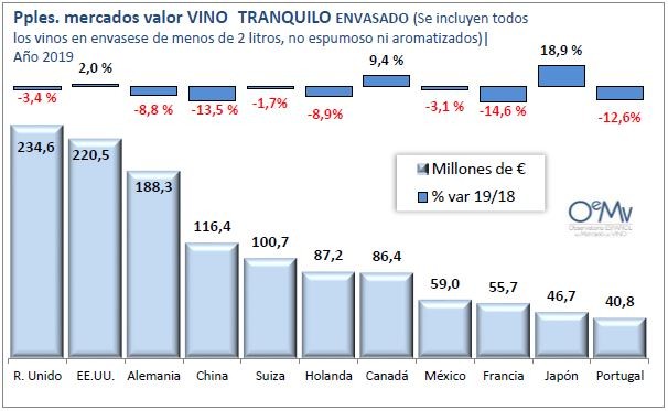 En términos de valor, es Reino Unido quien lidera el ranking con 234,6 millones de euros, y caída del -3,4%, seguido por EE.UU., con 220,5 millones de euros y aumento del +2%. Habrá que seguir la evolución de ambos mercados, para ver la reacción del vino envasado español en el mercado estadounidense tras la entrada en vigor de los nuevos aranceles y la entrada en vigor del Brexit, en el caso de Reino Unido.