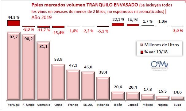 En su conjunto y por mercados, los vinos envasados no espumosos ni aromatizados (es decir, incluyendo vinos tranquilos, generosos y de aguja) crecen también, en 2019, en Japón y Canadá, mientras cae la mayoría del resto de principales mercados. Particular fue, el pasado año, el caso de Portugal que, tras un fortísimo incremento de las exportaciones de vinos españoles a este mercado en volumen, del 44% desde los 64,3 hasta los 92,7 millones de litros, pasa a liderar la clasificación de nuestros mercados de envasados no espumosos en 2019. Sin embargo, tal crecimiento se produce a costa de una pérdida sensible del precio medio, que pasa de 73 a 44 céntimos de euro por litro, por lo que se pierde un 13% de facturación, hasta situarse en 40,8 millones de euros en 2019. Todo lo cual hace sospechar en ventas a este mercado de vinos de muy bajo valor, posiblemente más en cartón que en botella y quizás para su reexportación.