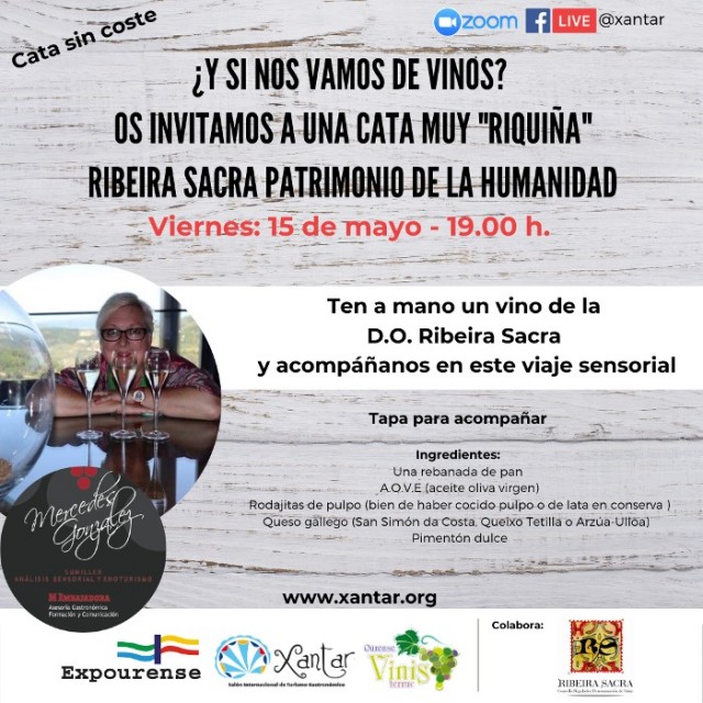 El ciclo denominado “catas riquiñas” estará guiado por la experta en catas, Mercedes González Rodríguez. Este viernes 15 de mayo a las 19.00 h. comienza el ciclo con vinos de la D.O. Ribeira Sacra. Esta cita con los vinos de la D.O. Ribeira Sacra pretende también servir para apoyar la candidatura de la Ribeira Sacra a Patrimonio Mundial de la Humanidad de la UNESCO, que fue uno de los hilos conductores de la última edición de Xantar.