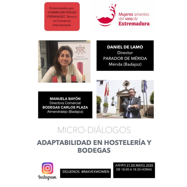 Mañana, 21 de Mayo, y con el tema "Adaptabilidad en bodegas y hostelería" serán entrevistados, en primer lugar a las 18:00, la Directora Comercial de la bodega extremeña Bodegas Carlos Plaza, Vicepresidenta de Mavex y en segundo lugar, a las 18:15 aproximadamente, Daniel De Lamo Ramiro, Director del Parador de Mérida.