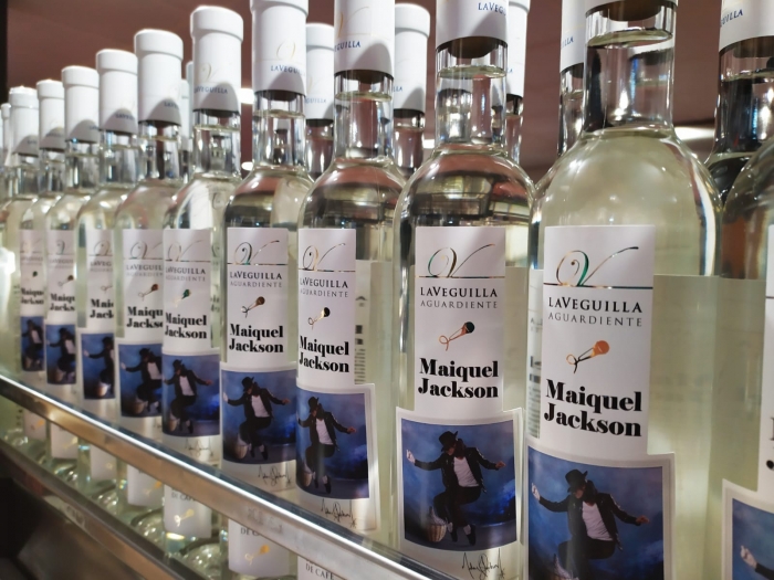 "Maiquel Jackson" es una vuelta de tuerca a nuestro aguardiente "Gotas Santas". Maiquel Jackson se define a si mismo como un sabroso néctar surgido de una doble destilación con macerado de café en el medio de su proceso de elaboración. Con los hollejos de nuestras uvas de Ribera del Duero elaboramos a través de alambique con lentilla de rectificación un aguardiente blanco, cristalino, de amplio aroma floral: "Gotas Santas". Parte de ese aguardiente lo dejamos macerando durante 30 días en café en grano de tres variedades, cacao, canela en rama y cáscara de limón, para después volverlo a destilar –esta vez por columna de vapor–, de forma que pierde el color pero conserva los aromas propios de un aguardiente de café (café, cacao, chocolate, torrefacto...), todo un licor de café, pero a la visual, blanco transparente. El nombre hace honor al gran rey del pop, que como nuestro aguardiente, nace negro, pero luego se vuelve blanco, es un guiño a su personaje. Con todo cariño y siempre dentro del humor que nos caracteriza