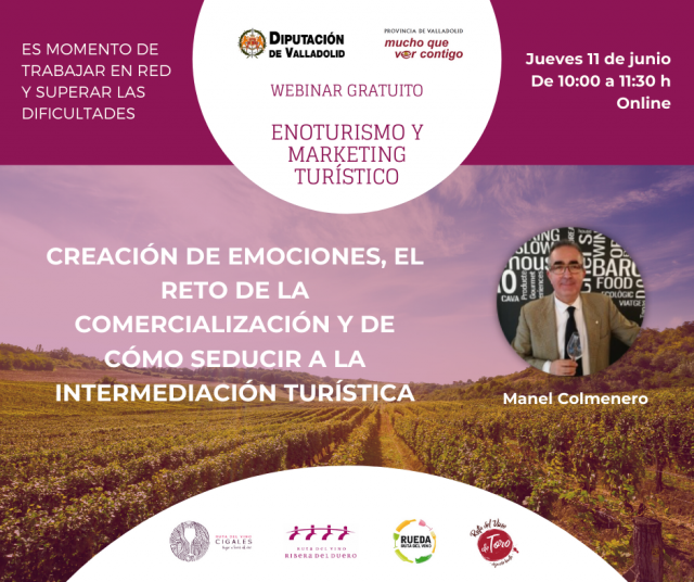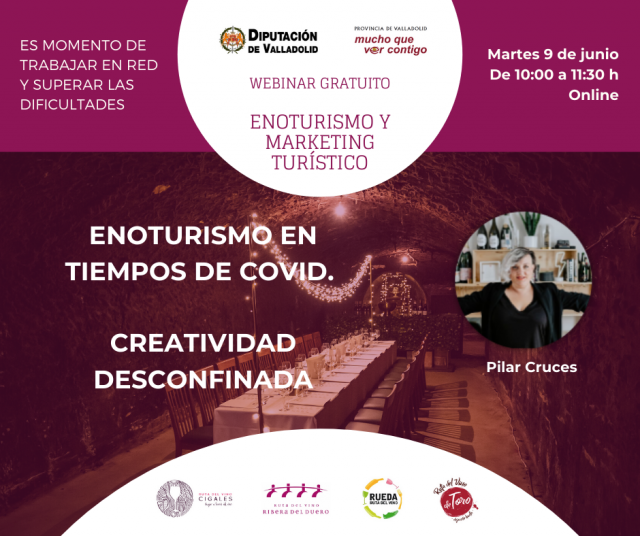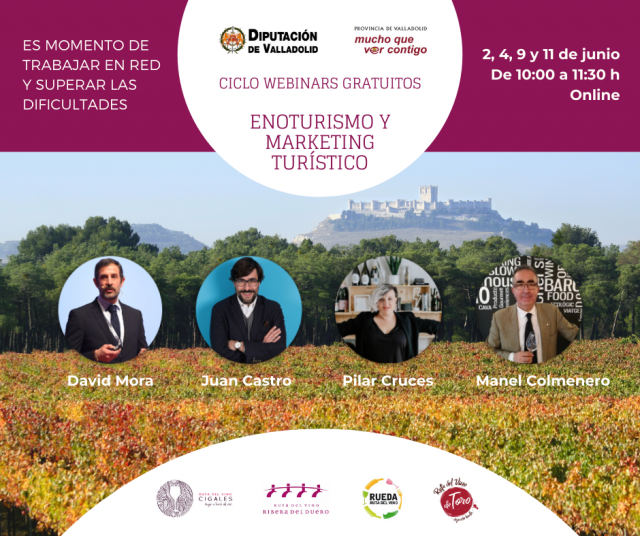 La Diputación de Valladolid en colaboración con las Rutas del Vino de Cigales, Ribera de Duero, Rueda y Toro, ha organizado un programa formativo de cuatro webinars para profesionales del sector turístico impartido por cuatro de los mejores ponentes a nivel nacional en enoturismo.